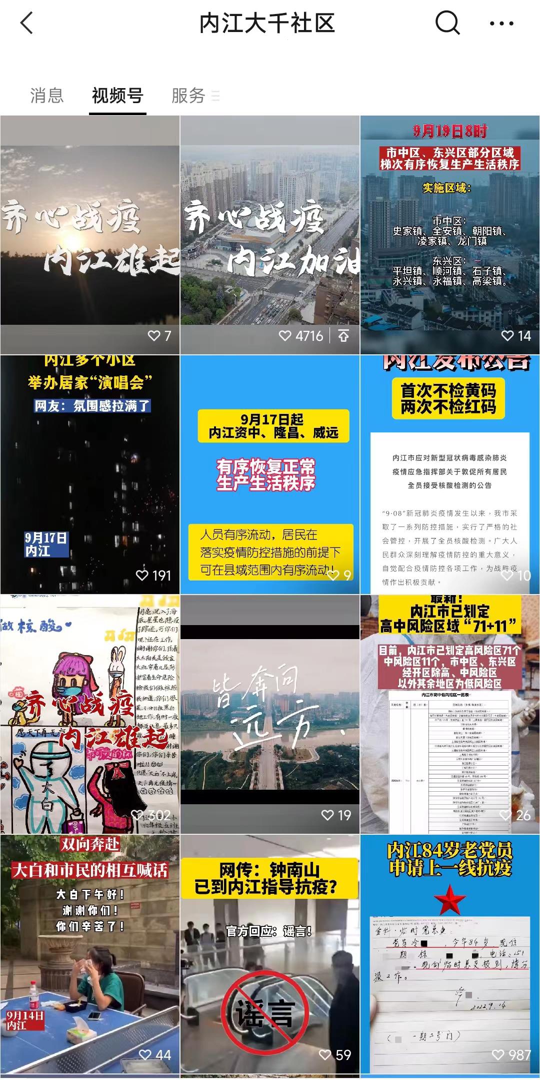三是发挥优势弘扬主旋律、传播正能量。市网联会统筹全市自媒体、网络大V等,积极创作反映疫情防控中出现的各类正能量新媒体作品200余篇,营造了强信心、暖人心、聚民心的网上舆论氛围。内江第一城、内江大千社区等推出《共抗疫情 你我同行 内江加油》《内江疫情防控志愿者的一天》《齐心战疫 内江加油》系列短视频,在朋友圈群得到广泛传播;内江身边事在微博平台开设话题#内江抗疫正能量#,开通《内江抗疫互助贴》,话题阅读量达2300万次。