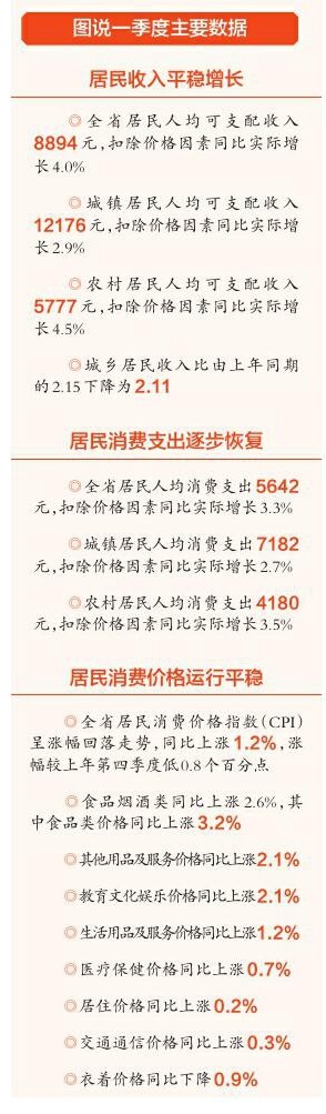 数据显示,一季度全省居民人均消费支出5642元,同比名义增长4.6%,扣除价格因素实际增长3.3%。
