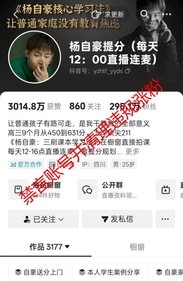 1.抖音账号“杨自豪提分”、快手账号“杨自豪提分”、小红书账号“杨自豪提分咨询”在教育领域“贩卖”焦虑带货卖课,造成恶劣影响。涉及的账号已依法依约处置。