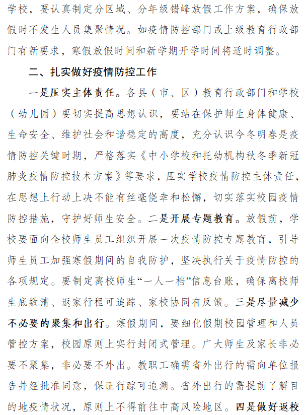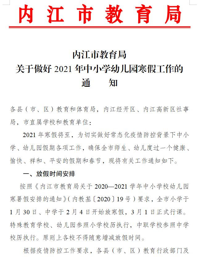 2021年寒假将至,为切实做好常态化疫情防控背景下中小学、幼儿园假期各项工作,1月18日,内江市教育局印发了《关于做好2021年中小学幼儿园寒假工作的通知》,明确了放假时间安排、做好疫情防控工作等相关内容。