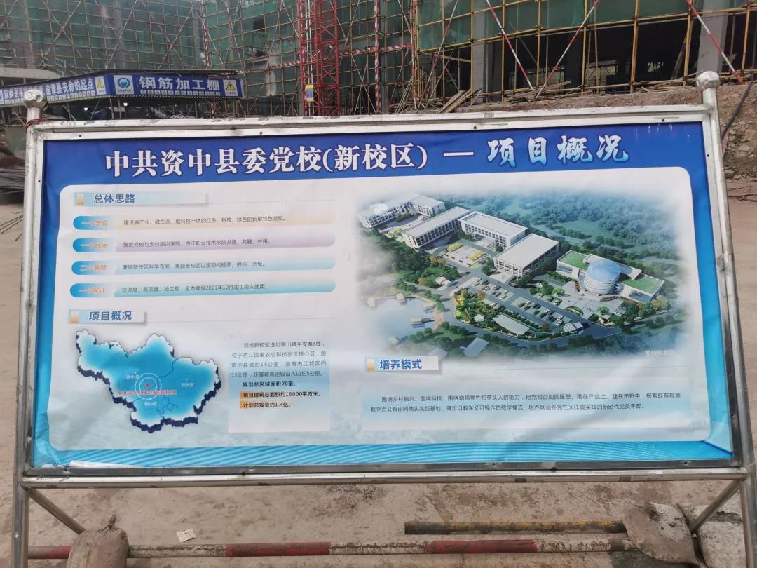 在资中县银山镇平安寨3社,规划面积70亩,项目总建筑面积15000平方米,计划总投资1.4亿元的资中党校新校区正如火如荼的建设中。