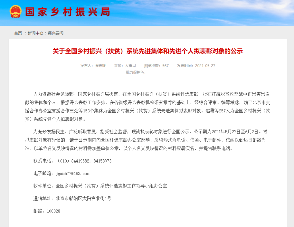 5月27日,全国乡村振兴(扶贫)系统评选表彰工作领导小组办公室发布全国乡村振兴(扶贫)系统先进集体和先进个人拟表彰对象。