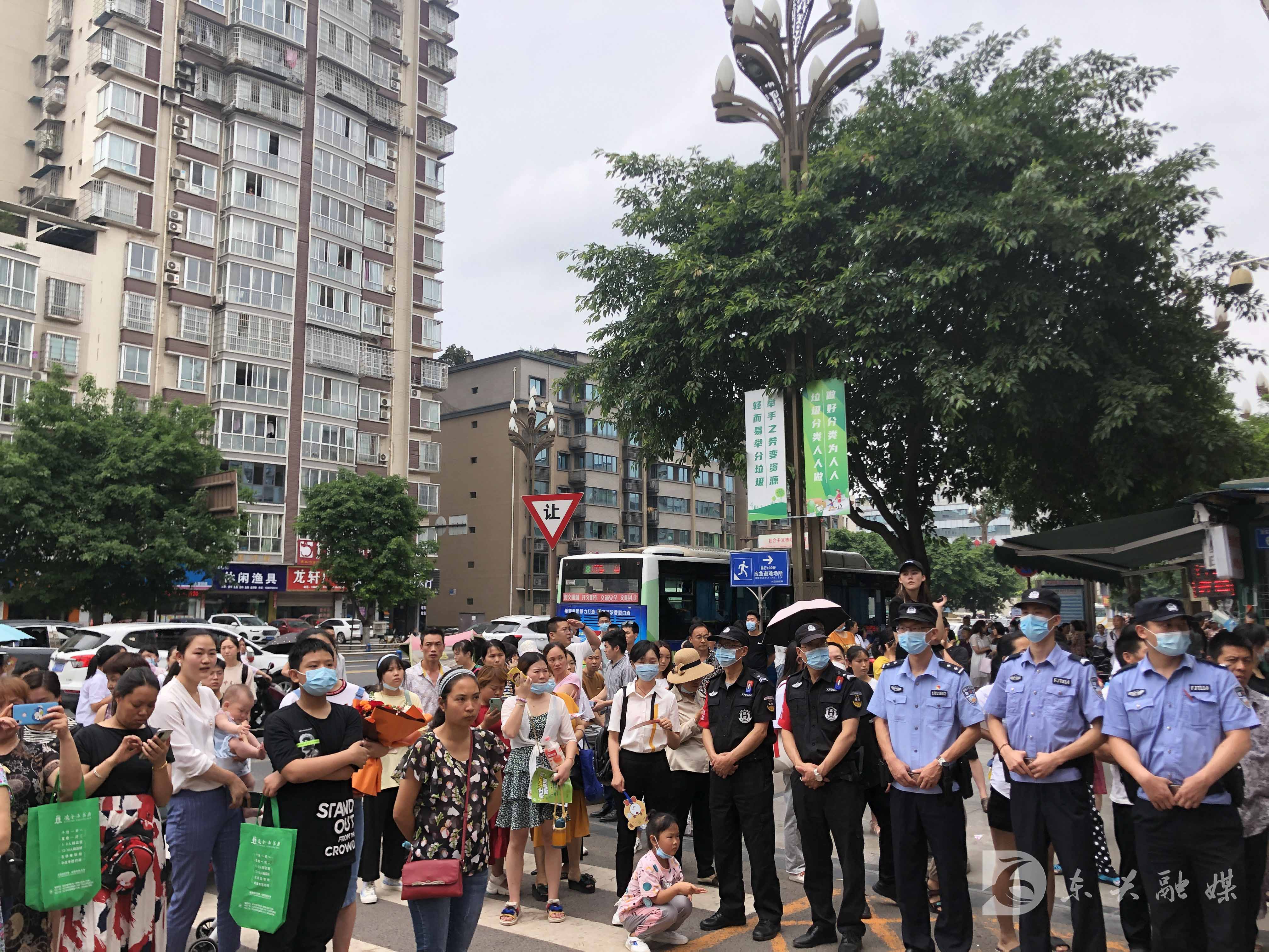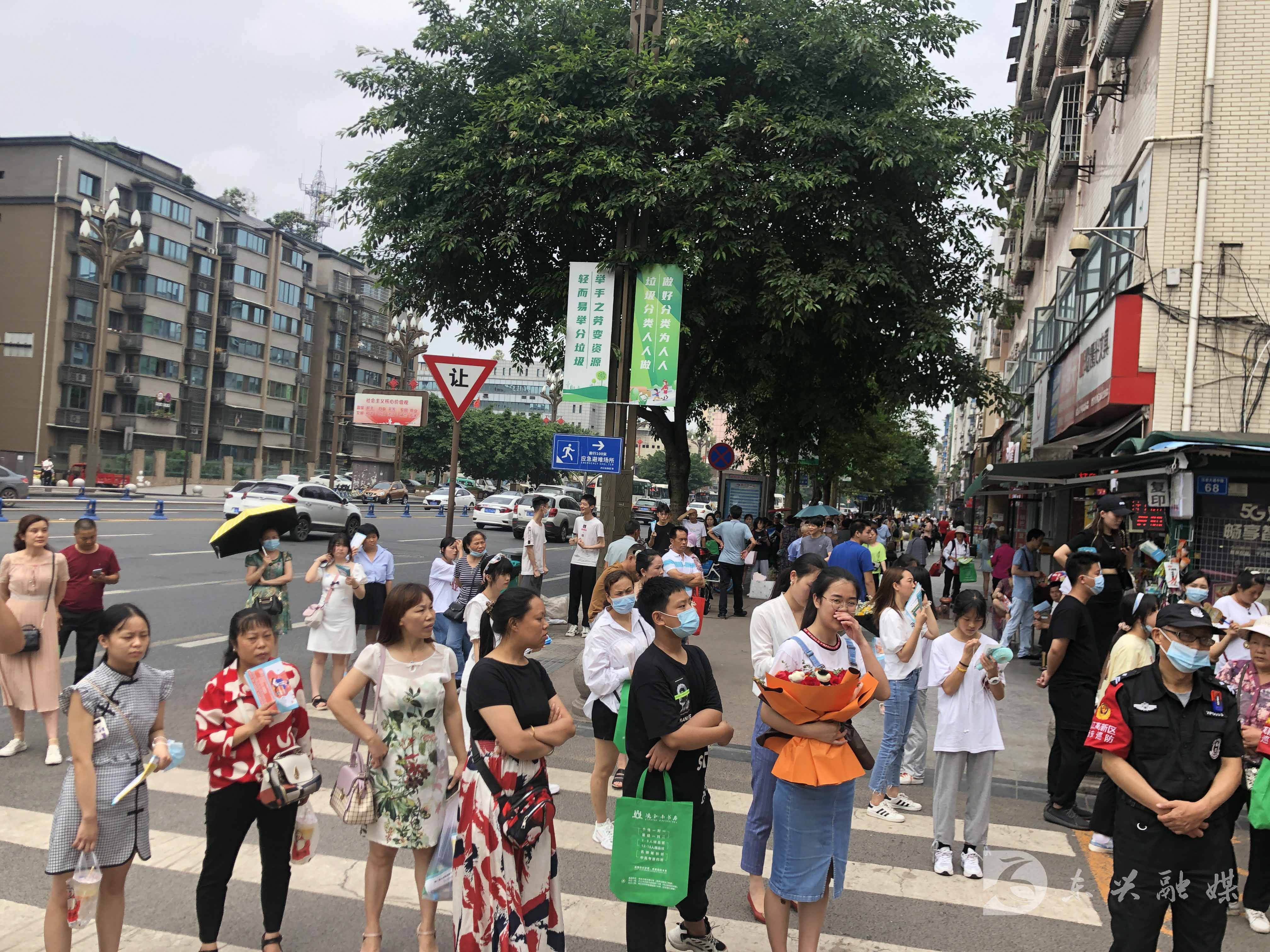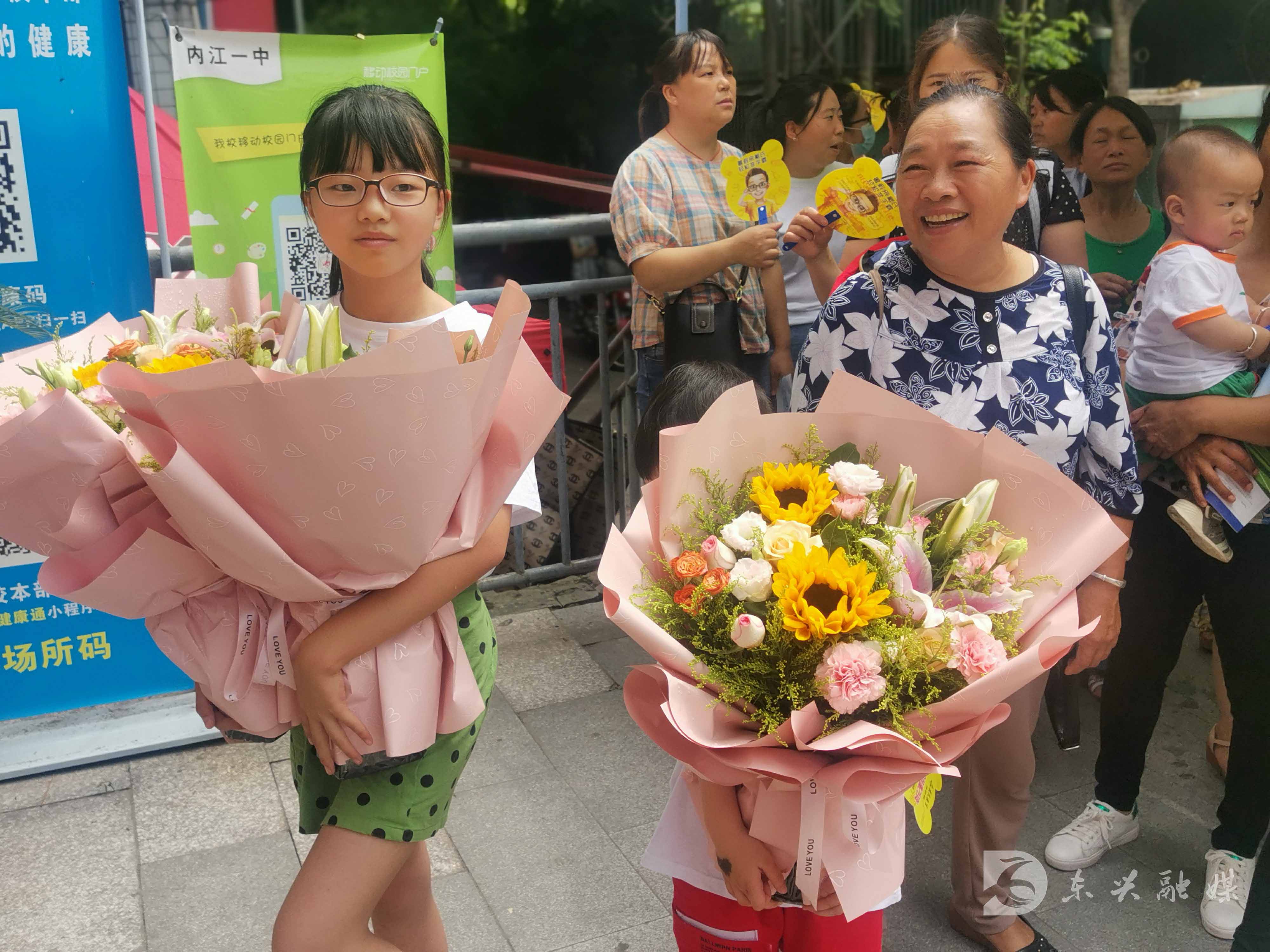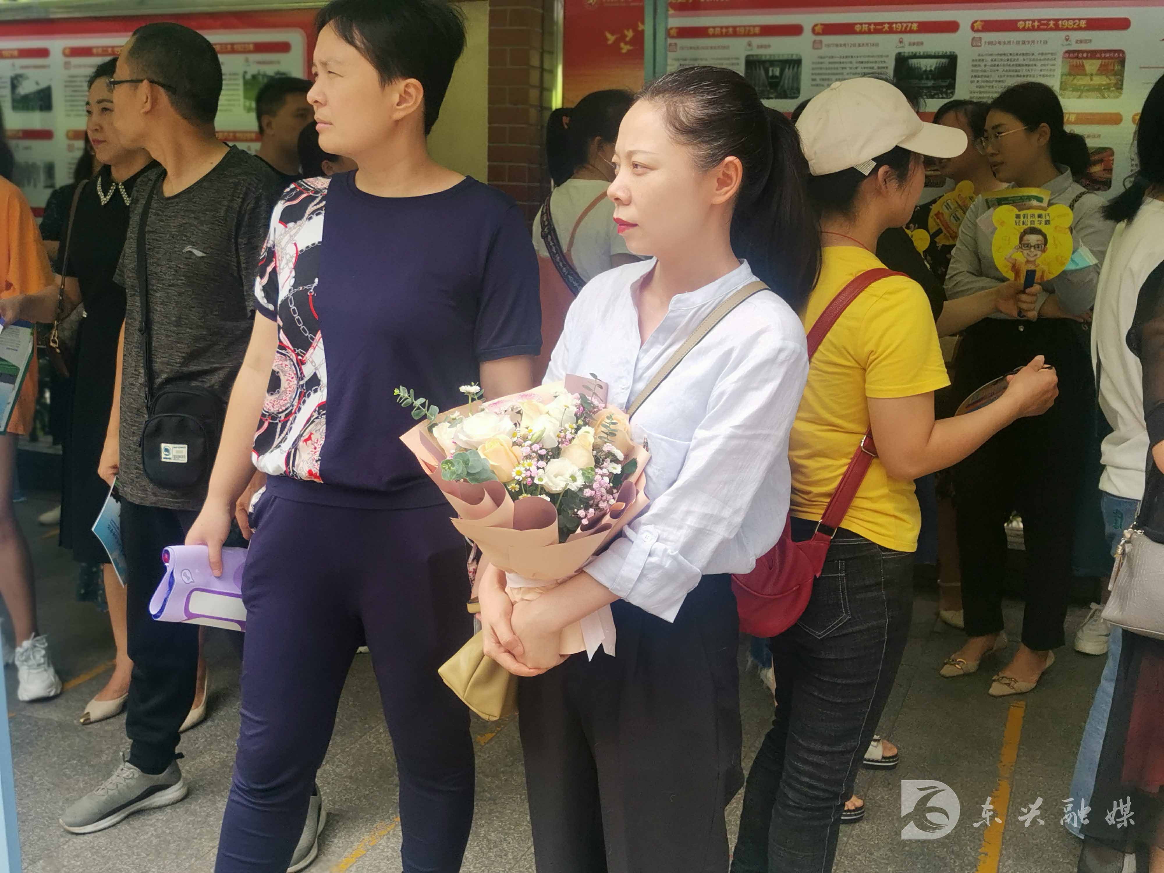 在三中考点附近,家长们早已拿着鲜花翘首以盼。听着考点里考试结束铃声的响起,家长们一时间躁动起来,纷纷向校门口走近。考生陆续走出考场,步伐矫健轻松,一脸喜悦。