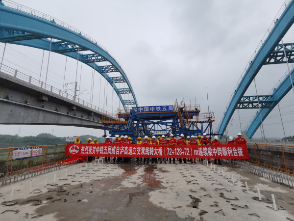 时间:2021-06-15 16:18:23 来源:四川观察6月15日,记者从成兰铁路有限责任公司获悉,成都至自贡高速铁路全线控制性工程——成自泸高速立交双线特大桥悬臂连续梁中跨实现合龙,成功跨越成自泸高速公路。目前,成自高铁全线已从线下工程施工逐步转入以线上工程施工为主的新阶段。