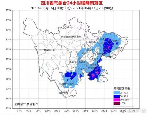 四川省气象台6月16日16时发布暴雨蓝色预警:16日20时到17日20时,巴中、南充、遂宁、自贡、宜宾、乐山6市及达州、广安、泸州、成都、眉山5市西部,广元、资阳、内江、绵阳、德阳、雅安6市东部,凉山州北部有大雨到暴雨(雨量40~70毫米),其中南充东部、宜宾南部及泸州西北部局地有大暴雨(雨量100~120毫米),并伴有雷暴大风等强对流天气。
