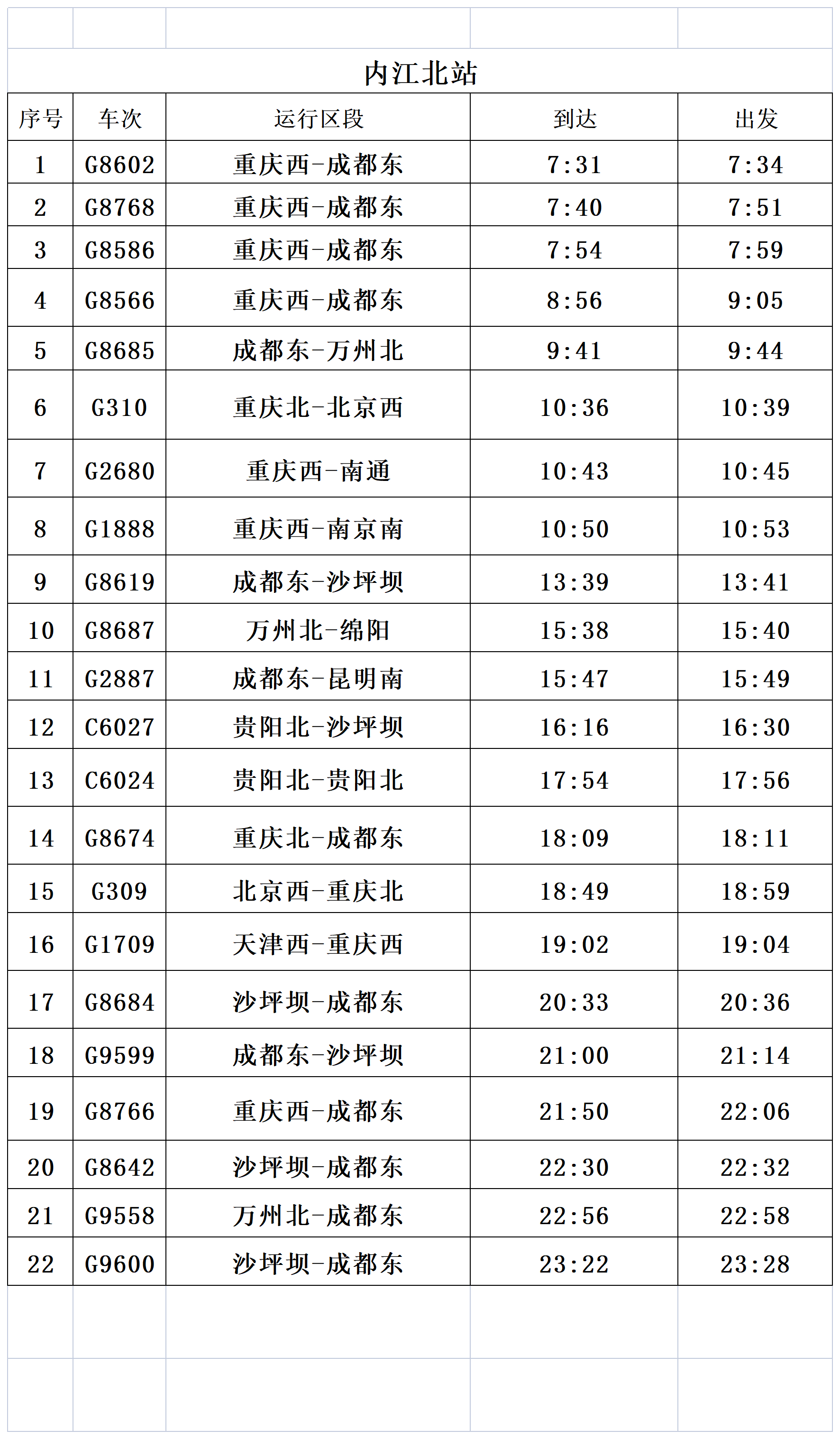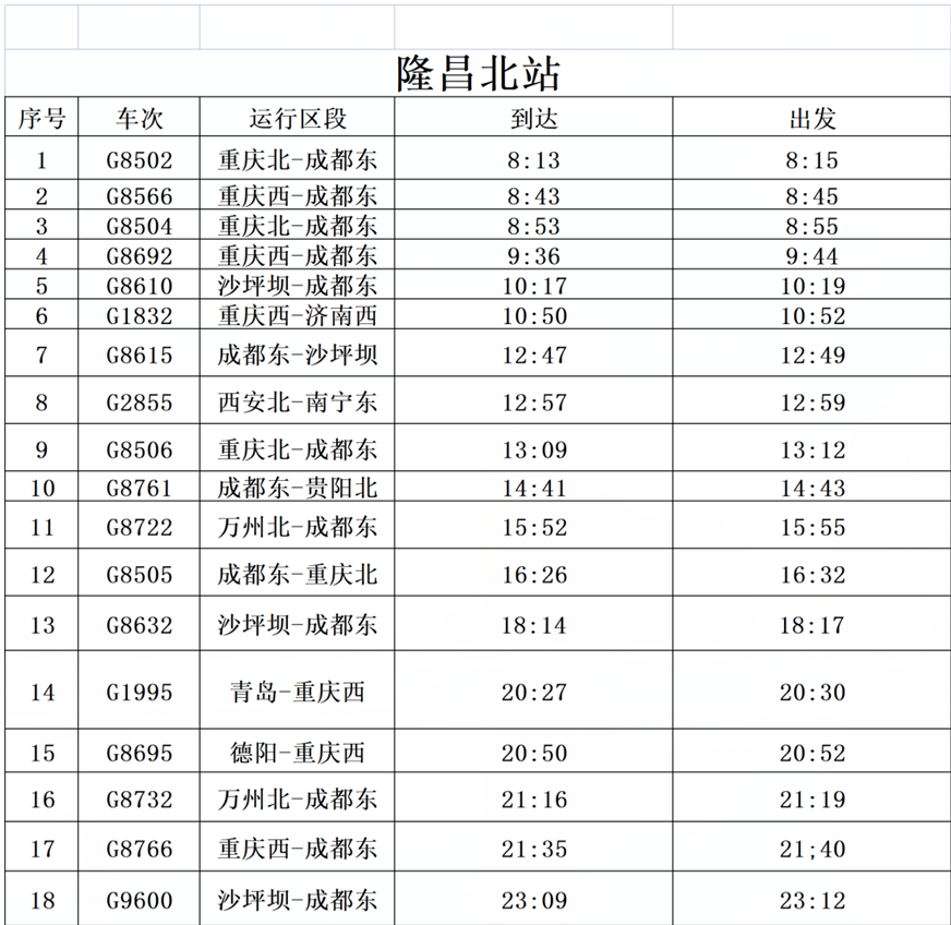 成都东~重庆北G8636/29次;成都东~隆昌北G8557/8次、长寿北(万州北)~成都东G8707/6 G8715/8次;成都东—重庆西G8639次;成都东~重庆西C6002/1次;重庆西—峨眉山G8754/5次、峨眉山—沙坪坝G8756/7次、沙坪坝—成都东G8512次;成都东—万州北G8705/8次、万州北—绵阳G8717/6次;重庆西—成都东G8514次;成都东—内江北G8563次、内江北—德阳G8744次、德阳—内江北G8745次、内江北—德阳G8746次、德阳—重庆西G8747次。
