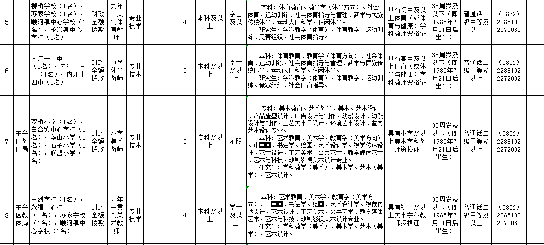 1.内江市东兴区2021年公开考核招聘农村义务教育学校音乐、体育、美术教师岗位条件一览表