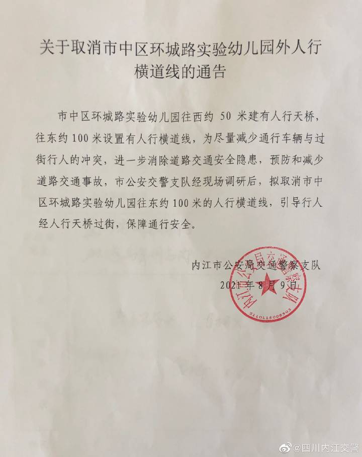 时间:2021-08-09 12:27:47 来源:四川内江交警微博刚刚,内江市公安交警发布了关于取消市中区环城路实验幼儿园外人行横道线的通告,详情如下: