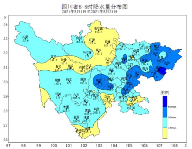 8月,四川暴雨天气过程频发,对农业生产、水利、交通等方面造成了不同程度影响。据四川气象部门监测,8月全省平均降水量249.0毫米,较常年同期偏多37%,位列历史同期第5多位,暴雨站次数列历史同期第7多位。