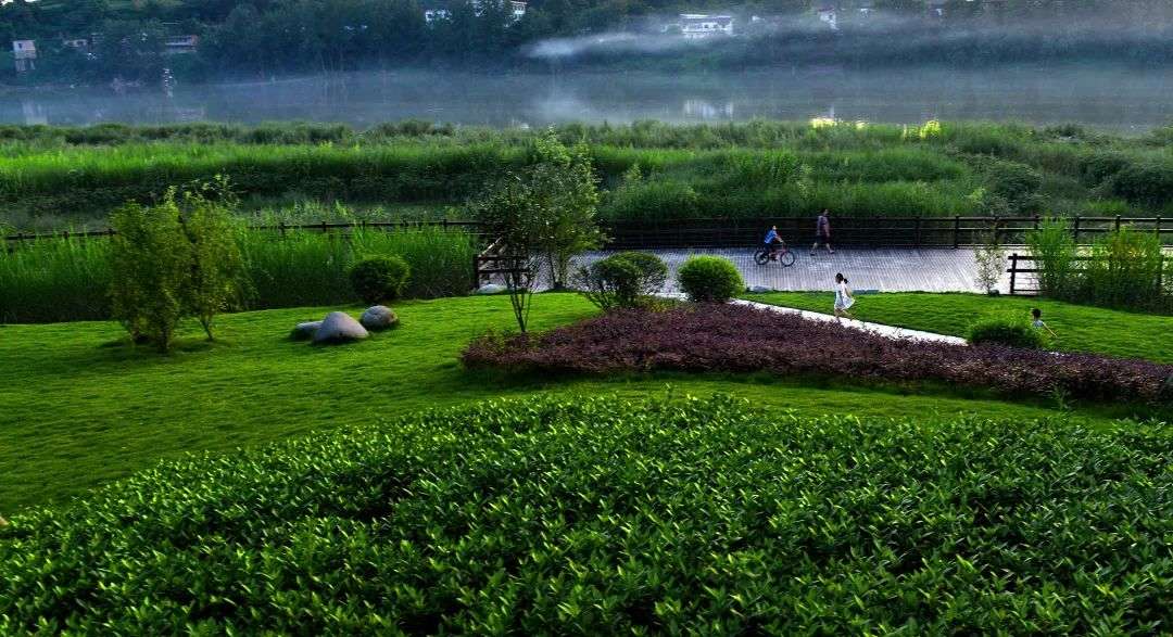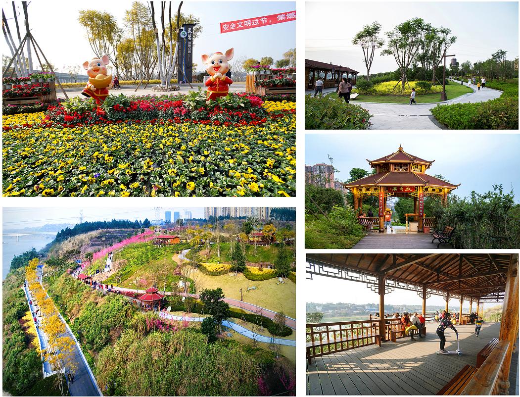公园实施园林绿化景观建设,保留原有自然山体和原生松林植被并进行林相改造,配建公厕、篮球场、极限运动场、小品建筑、照明亮化和背景音乐系统等,修建沿江亲水步道。同时,为纪念唐朝状元范崇凯,拟修建“花萼楼”,设置范崇凯雕塑和其撰写的“天下第一赋”——《花萼楼赋》碑刻,营造既自然野趣又文化浓郁的滨江生态湿地公园,连接新坝大桥以南已建成的清溪湿地公园,并与沱江对岸拟建的邓家坝滨江湿地公园呼应,构建内江沱江滨水绿色生态廊道。