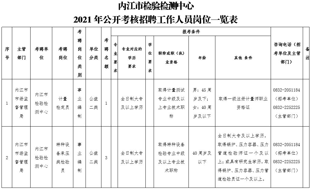 (2)全日制大专及以上学历,且具有计量测试专业中级及以上专业技术职称。详见《内江市检验检测中心公开考核招聘工作人员岗位一览表》(附件1);