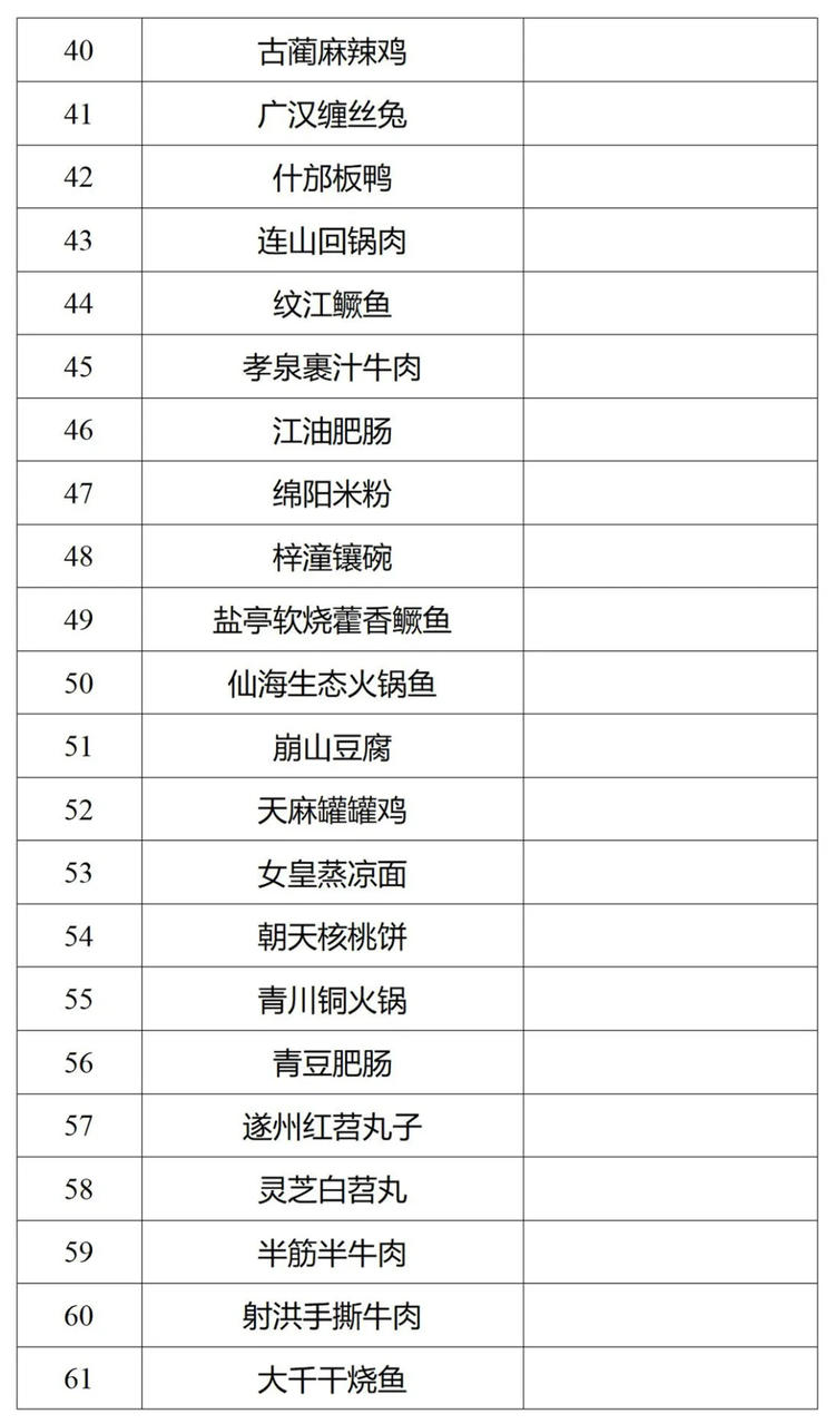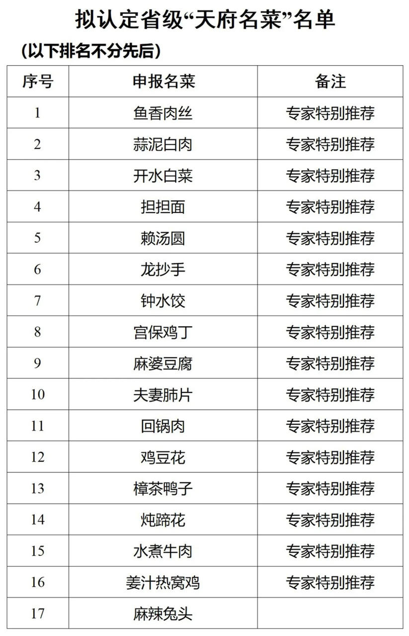 江粉儿从四川省商务厅官网获悉,经市(州)评选推荐、网络投票和专家评审,现对省级“天府名菜”拟认定名单予以公示。公示期为11月30日—12月6日。