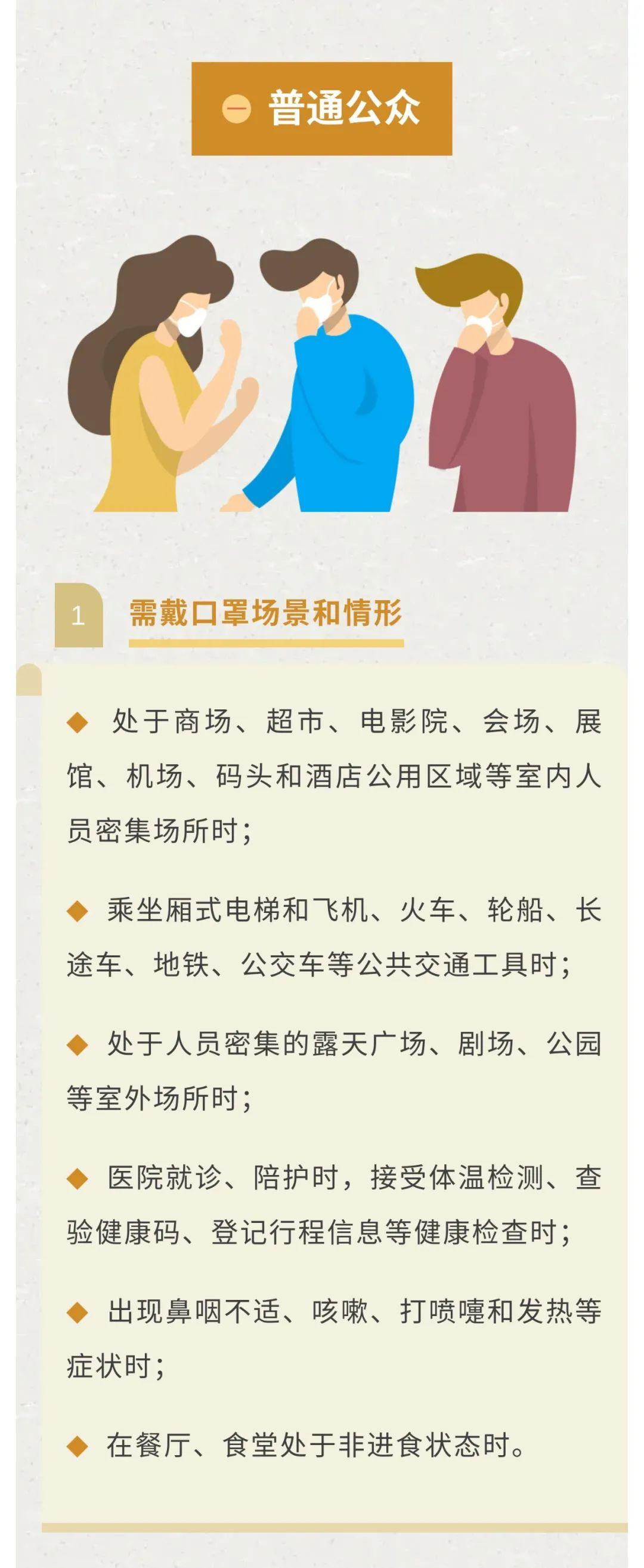公众在公共场所要遵守场所管理规定,规范佩戴口罩,保持社交距离,尽量少触碰扶手等公共物品,不要用手直接接触口、眼、鼻。各类公共场所、经营场所严格落实扫场所码、查验健康码、测温、消毒、通风、监督戴口罩等防控措施。