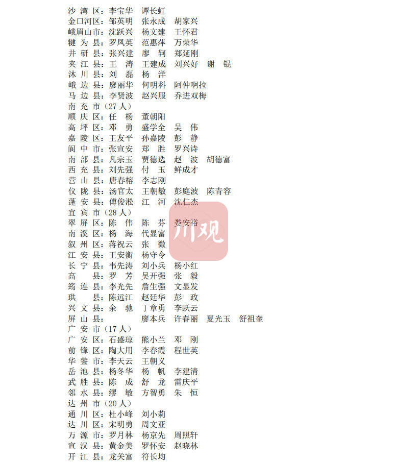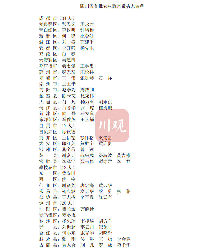 时间:2022-01-12 11:40:22 来源:川观新闻1月11日,记者从省农业农村厅获悉,四川省首批农村致富带头人名单已出炉,共有500人入选,其中,成都市34人,自贡市17人,攀枝花市12人,泸州市20人,德阳市17人,绵阳市25人,广元市20人,遂宁市15人,内江市15人,乐山市30人,南充市27人,宜宾市28人,广安市17人,达州市20人,巴中市15人,雅安市20人,眉山市17人,资阳市12人,阿坝州39人,甘孜州54人,凉山州46人。