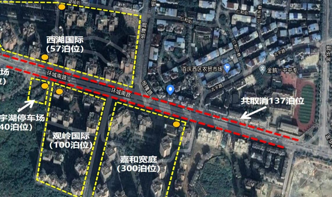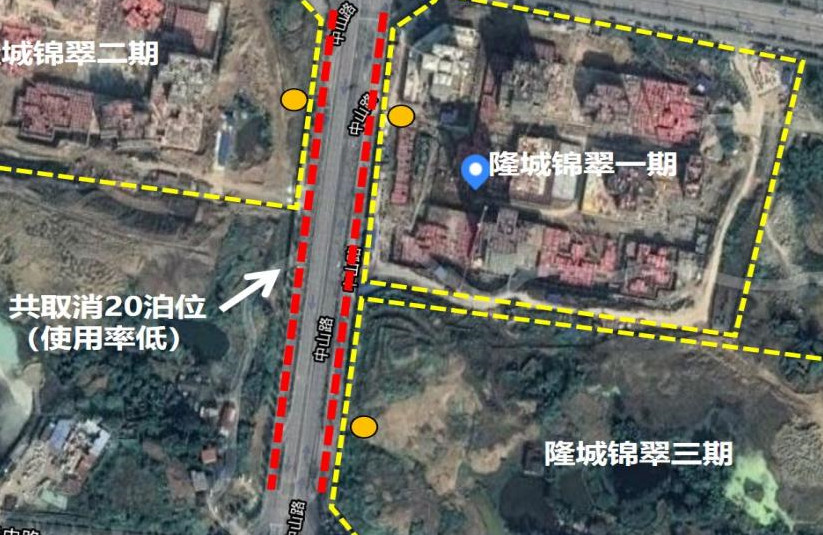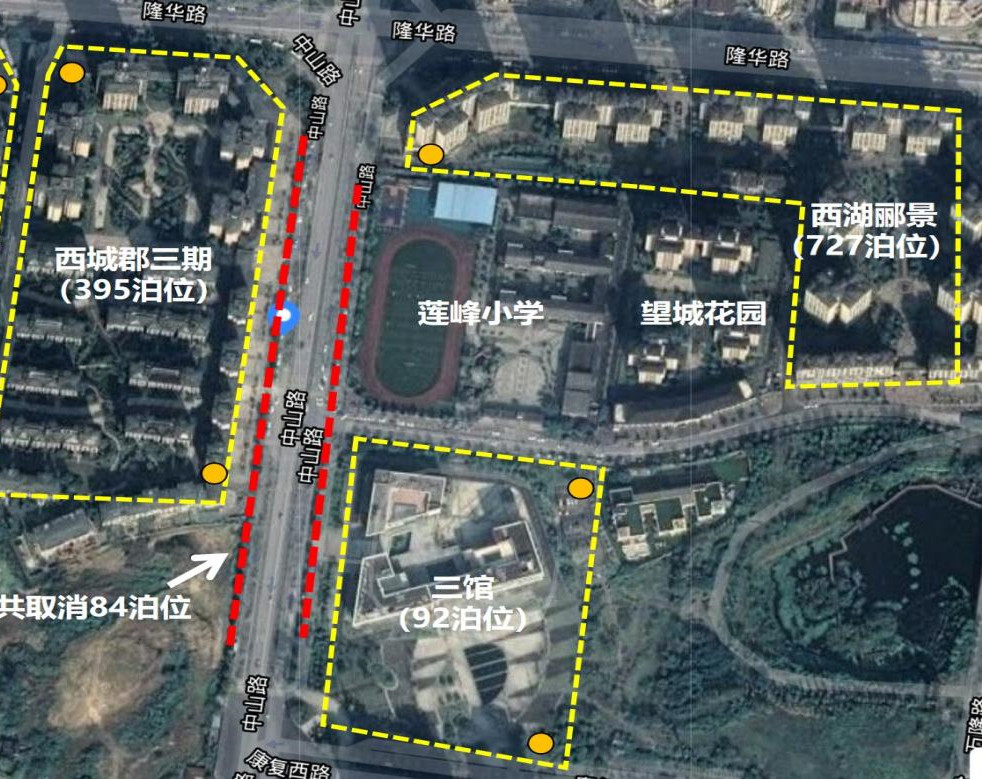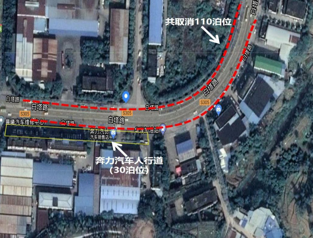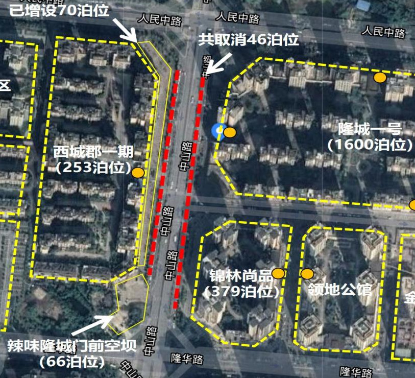 环城南路、白塔路、中山路、万隆路、隆华路临时停车泊位优化示意图(红色虚线为取消车位)。