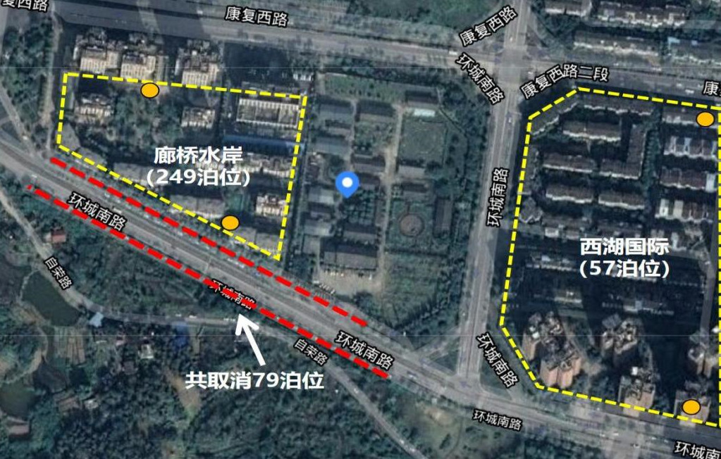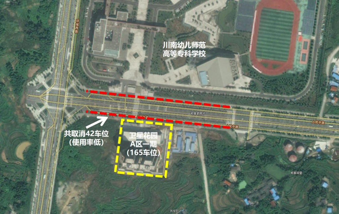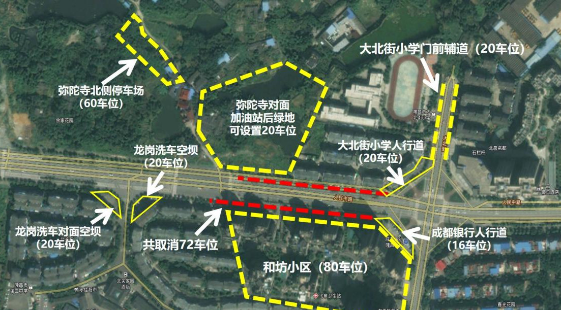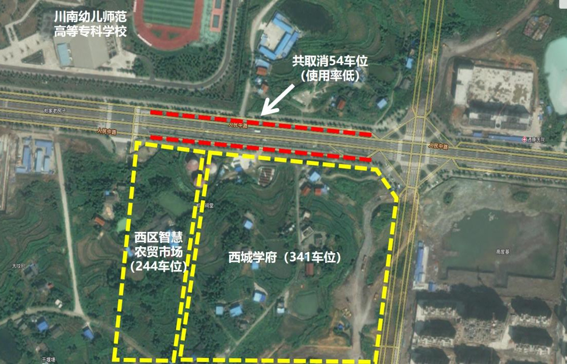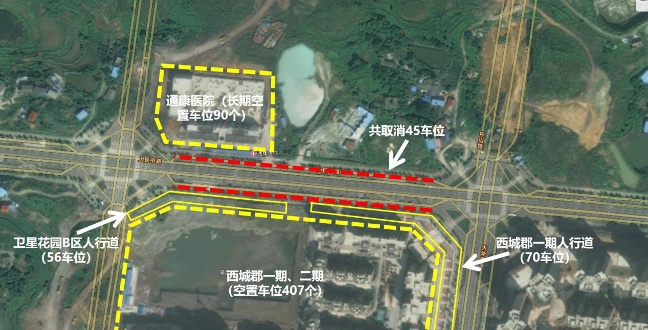 人民中路临时停车泊位优化示意图(红色虚线为取消车位)。