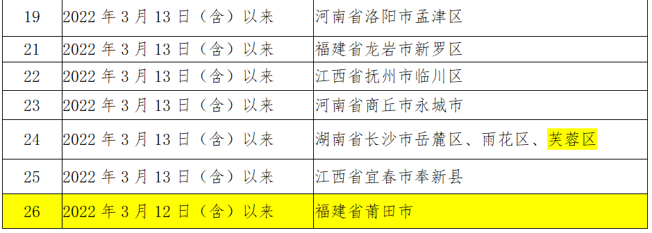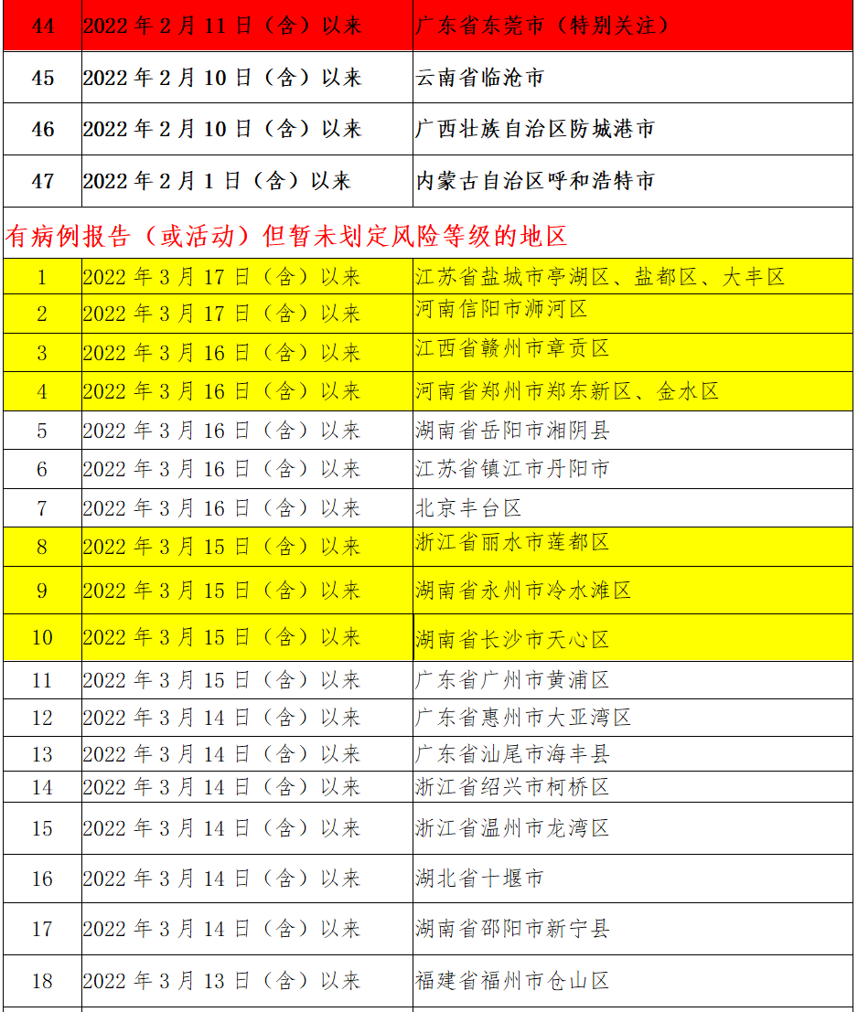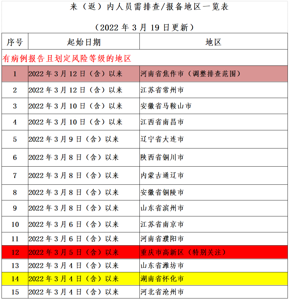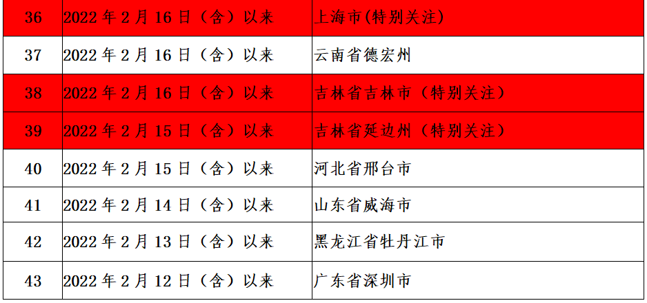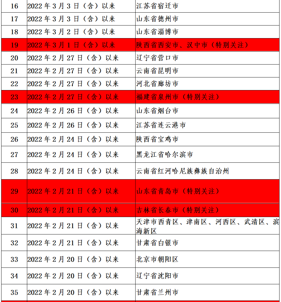 近期要重点关注重庆市、广东省东莞市、深圳市,山东省青岛市、威海市,上海市,吉林省长春市、吉林市,河北省廊坊市、沧州市,甘肃省兰州市,江苏省连云港市,天津市,陕西省西安市、宝鸡市、福建泉州市疫情,不前往高、中风险地区以及发生本土疫情的地区。