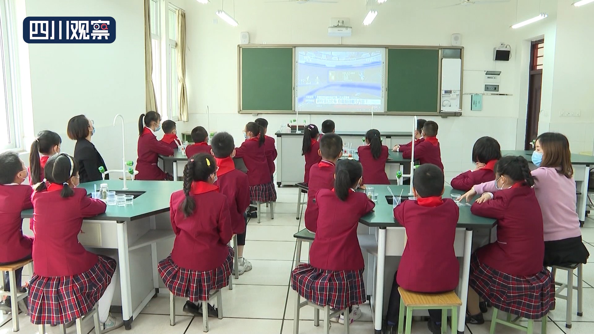 授课期间,天宫课堂——中国流动科技馆内江站内江东兴区外国语小学分场和内江市第十小学的师生们守候在直播屏幕前学习观摩,并进行了天地互动实验。