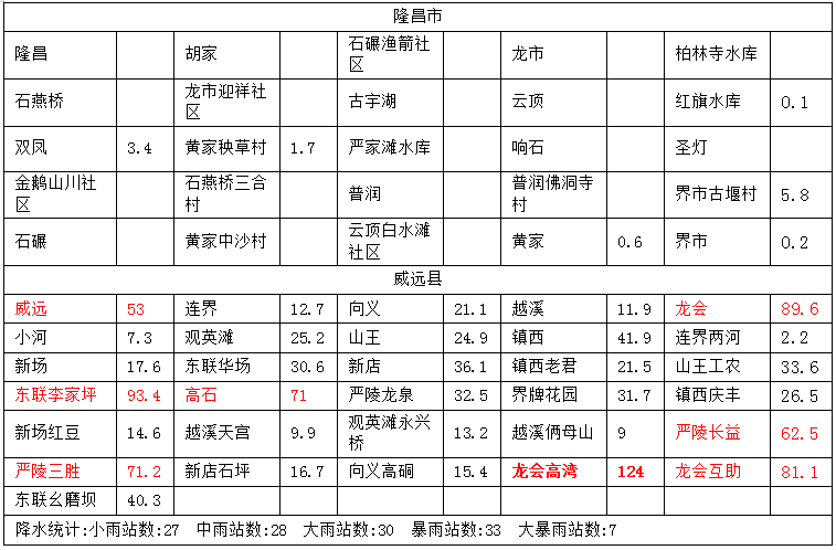全市145个观测站中降水量100毫米以上7个,主要出现在东兴区,50~100毫米33个,25-50毫米30个,10~25毫米28个。