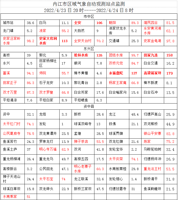 时间:2022-04-24 09:15:35 来源:内江市气象台内江市气象台发布最新雨情通报,详情如下: