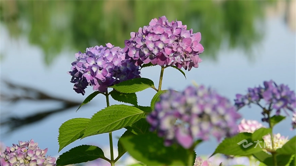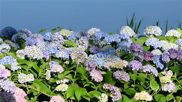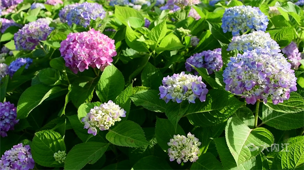 绣球花也叫八仙花、紫阳花、粉团花,绽放时百花成朵、团扶如球、颜色斑斓,素有花中“千面女郎”的美誉,具有花大色美的特点,花期可持续到7月上旬。除了绣球花,公园内还有马鞭草、美人蕉、蓝花楹等多个品种的鲜花争相绽放。