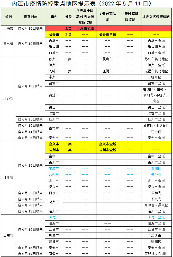 内江市疫情防控重点地区提示表(2022年5月11日)