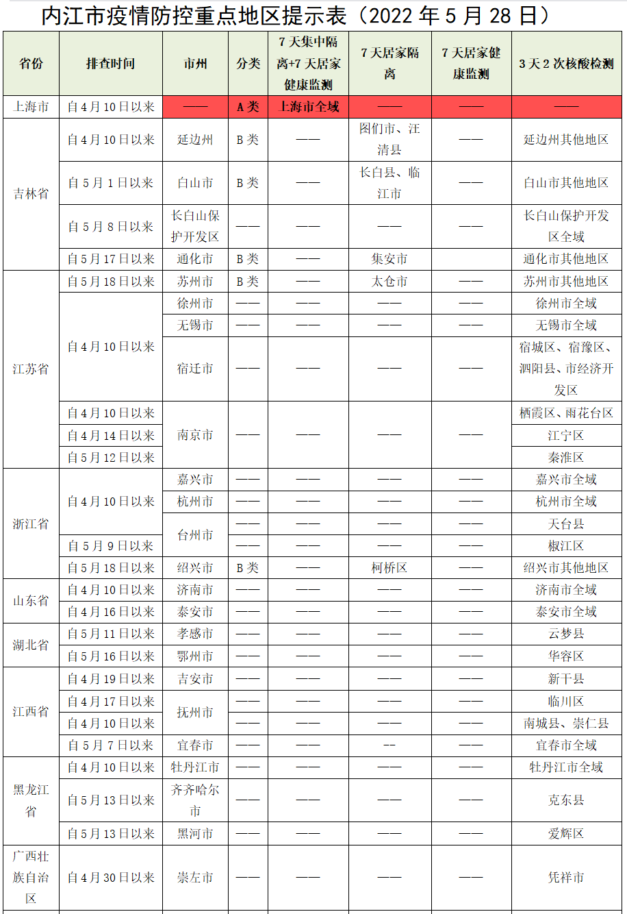 内江市疫情防控重点地区提示表(2022年5月28日)