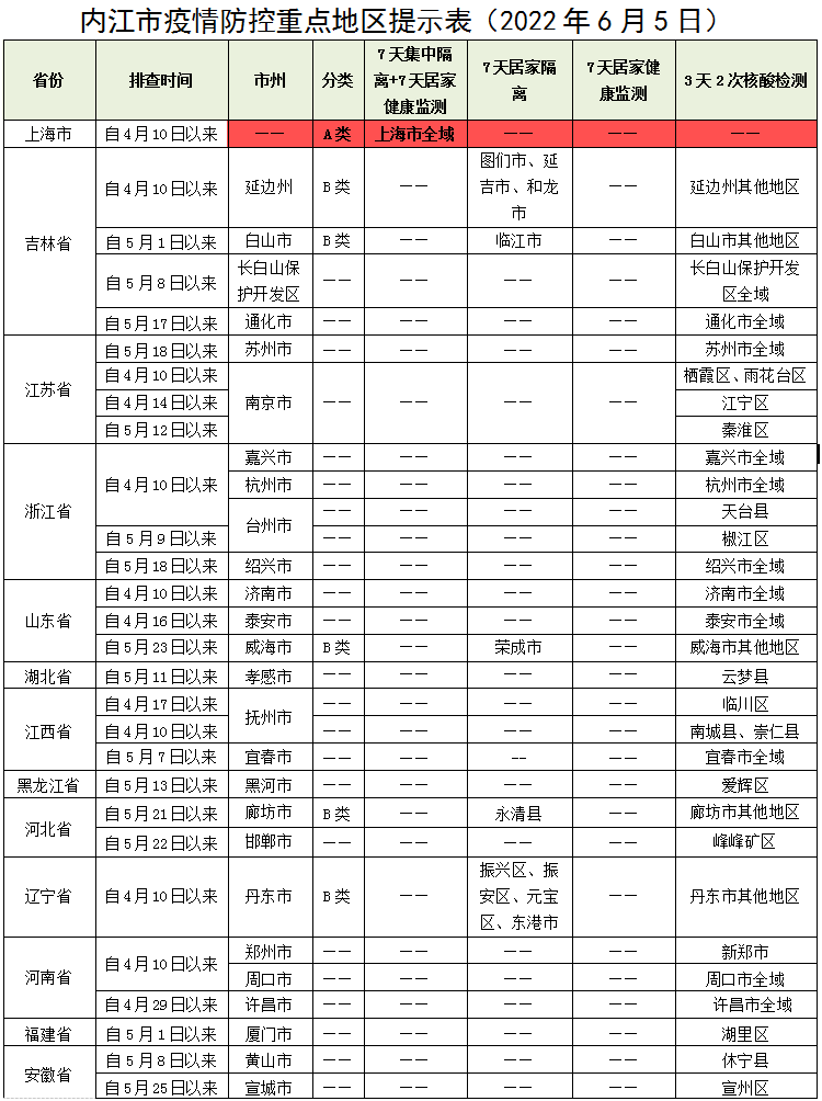 内江市疫情防控重点地区提示表(2022年6月5日)
