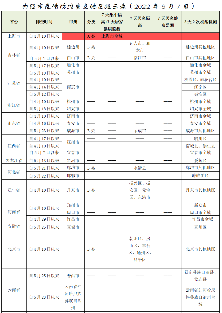 内江市疫情防控重点地区提示表(2022年6月7日)