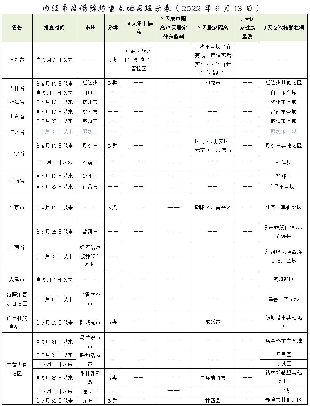 内江市疫情防控重点地区提示表(2022年6月13日)