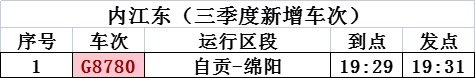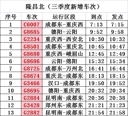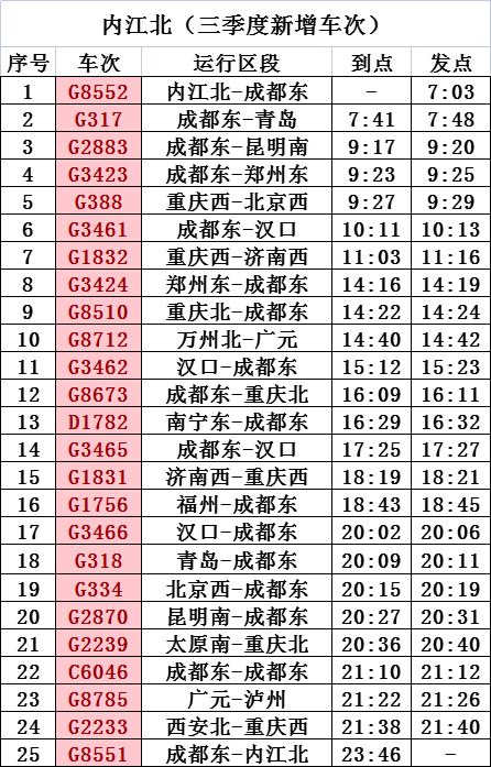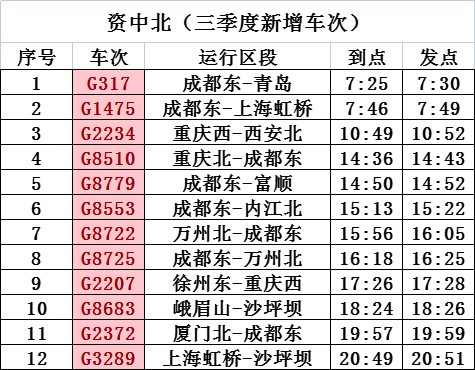 近日,江粉儿从内江车务段获悉,中国铁路成都局集团有限公司加开部分经停内江北站、隆昌北站和资中北站、内江东站的高铁列车。具体时间和车次如下: