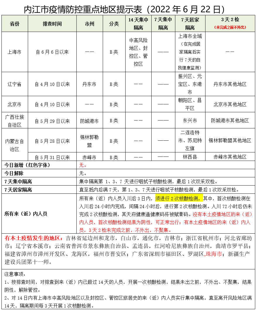 内江市疫情防控重点地区提示表(2022年6月22日)