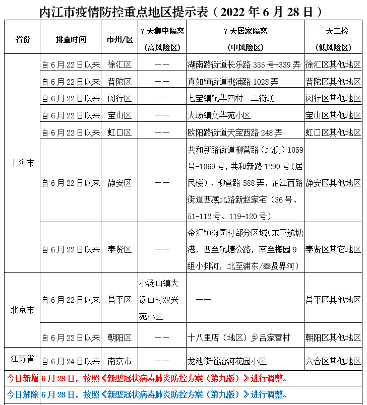 内江市疫情防控重点地区提示表(2022年6月28日)