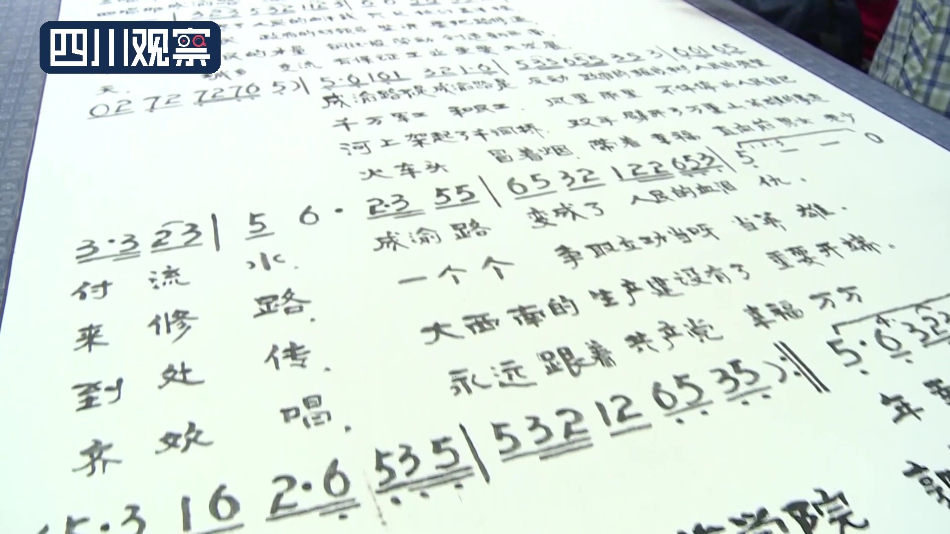 时间:2022-07-01 20:18:05 来源:四川观察“四唱成渝铁路,通车到成都。”7月1日,在位于内江的成渝铁路筑路民工纪念堂,82岁的内江师范学院退休教师郭长武唱起了《四唱成渝路》。据了解,《四唱成渝路》是人民音乐家时乐蒙为新中国成立后修建的第一条铁路——成渝铁路写的赞歌。作为成渝铁路建成通车的见证者,这首歌曲对郭长武有着特别的意义。在成渝铁路通车70周年之际,他和内江师范学院退休教师刘永新、肖真玉一起将该歌曲曲谱进行书写、装裱,制作成长2.6米、宽1.2米的竖轴作品,捐赠给了成渝铁路筑路民工纪念堂。