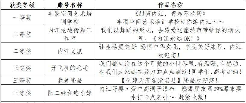 7月7日,记者从“文旅Yeah内江”抖音短视频大赛组委会获悉,大赛获奖名单已出炉,颁奖典礼将于7月16日晚举行。
