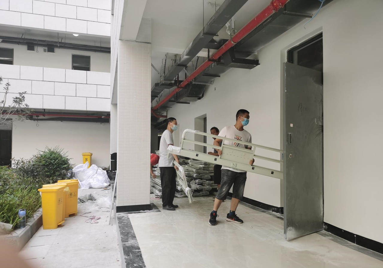 由于高级技工学校刚完工,寝室内设施还不完善。项目施工人员昼夜加班安装隔离床位和热水系统循环水泵,物业工程技术人员对隔离点房间内水电、照明、电梯、空调、热水等相关设备进行调试检查,并及时调整公共照明、监控等设备,以保障入住人员能正常使用。隔离人员入住后,物业工程技术人员还需提供隔离区域内供水、供电、电梯运行等设施设备的后勤保障工作。
