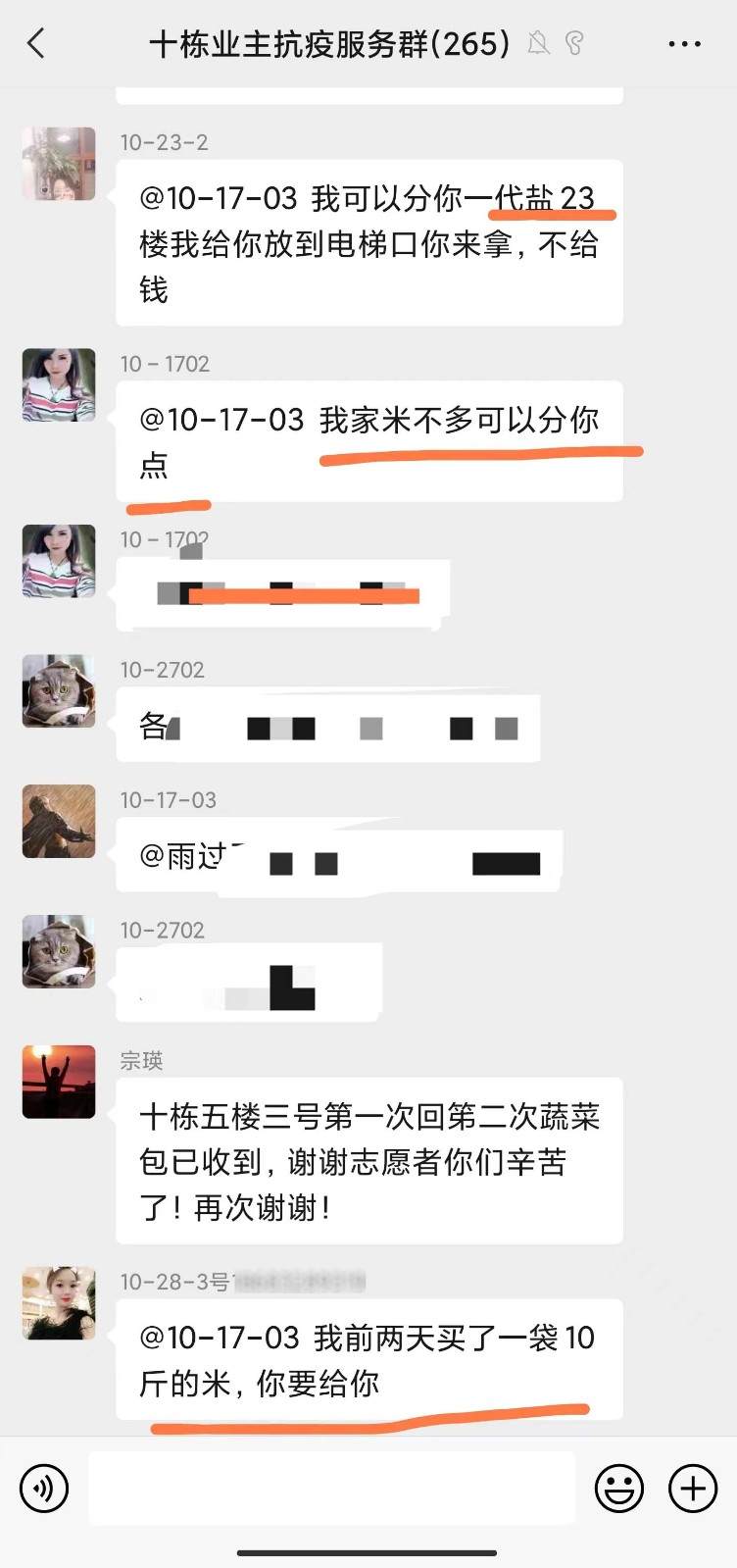 “3楼6号的两位老人没米了。” “叫谁在我5楼3号来拿米。”一位住户刚向微信群里发出求助,马上就得到回应。