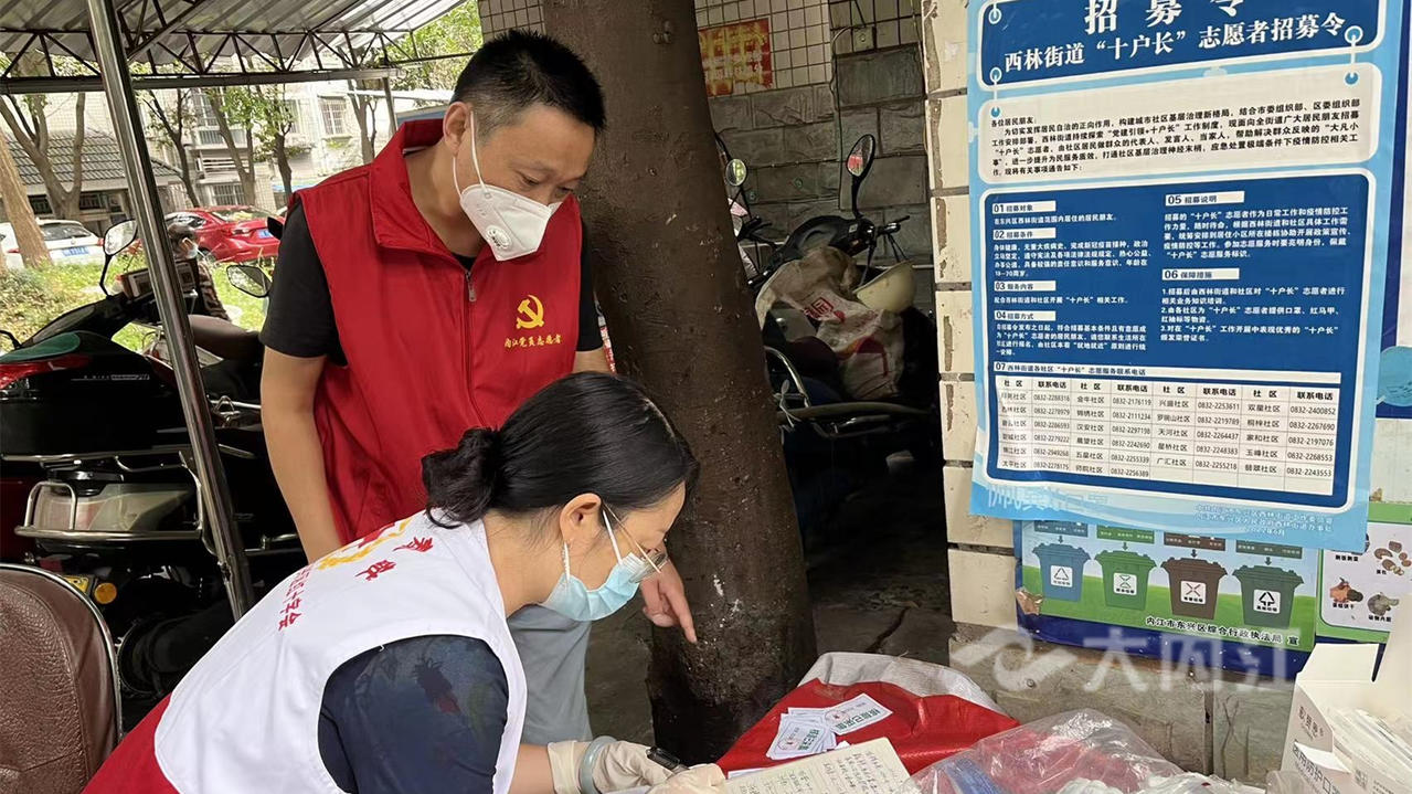 在东兴区锦绣花园小区,下沉一线的党员志愿者潘刚结束核酸检测工作后,又和业委会工作人员一起对小区内特殊人群开展入户走访,小区居民王玉书夫妇均患有帕金森病,行动不便,且子女未在身边,潘刚便和工作人员定期为老人送去生活物资,保障老人在封闭管理期间的生活需求。