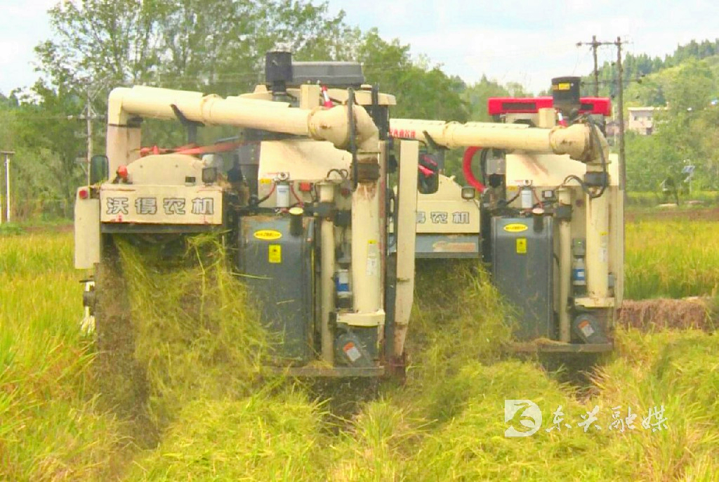 在收割现场,两台大型收割机正马力全开,在田地里不断穿梭,伴随着阵阵轰鸣声,一排排沉甸甸的稻穗被卷进机身,割稻、脱粒、吐秆一气呵成,空气中到处弥漫着稻谷清香。经过十几分钟的收割,眼前一片水稻便被收割完成。