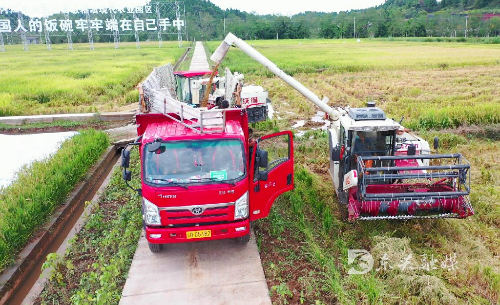 时间:2022-09-26 10:14:28 来源:东兴融媒自内江“9·08”疫情突发以来,东兴区上下齐心协力,团结一致,共同抗击疫情,取得了阶段性胜利,同时也进入晚秋收获时刻。9月25日,记者在田家镇东兴区省级粮油现代农业园区看到,晚秋水稻迎来大面积成熟,东兴区宏展粮油专业合作社抢抓晴好天气,组织人员、收割机对水稻进行收割,确保水稻颗粒归仓。