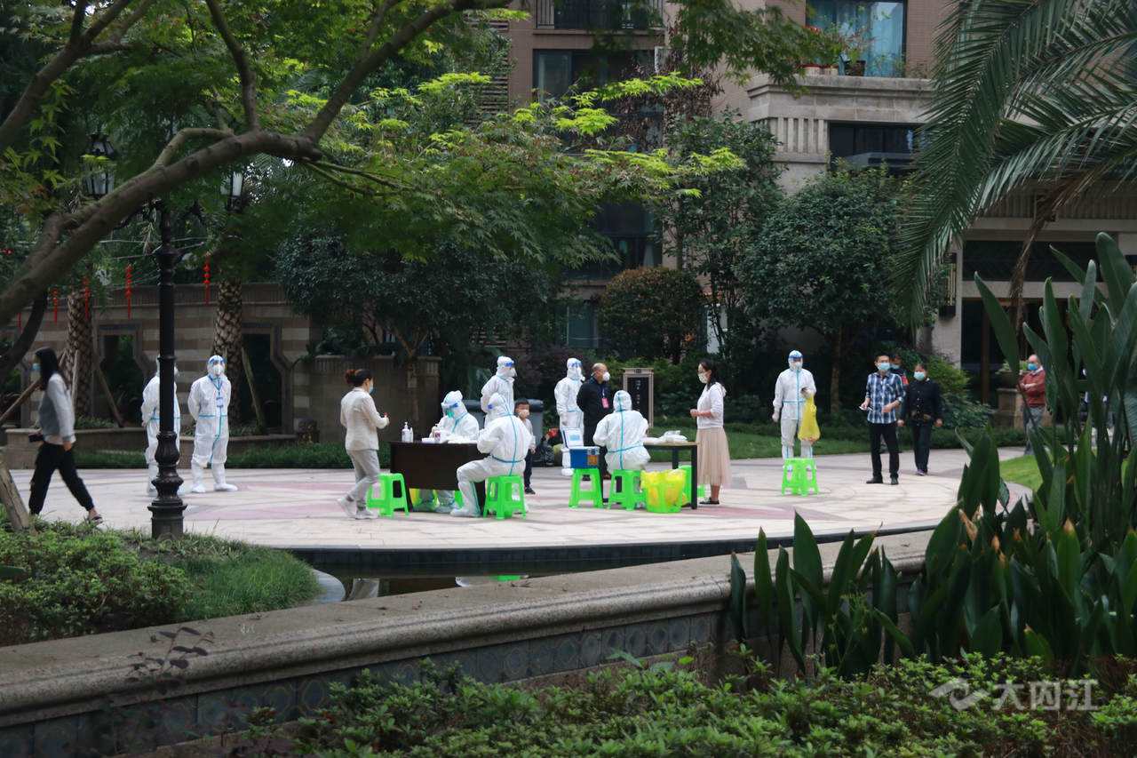 在市中区大千世界花园小区,居民们在社区网格员和志愿者的引导下,依次、有序下楼采集核酸。