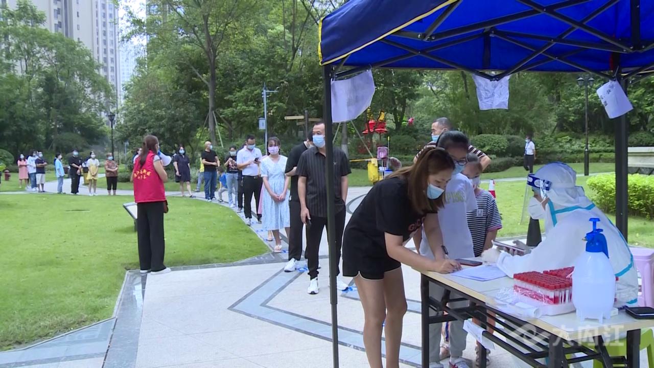 在东兴区碧云社区一核酸采样点前,志愿者、社区工作人员、医务人员通力协作,居民积极配合,整个核酸采样过程高效有序。