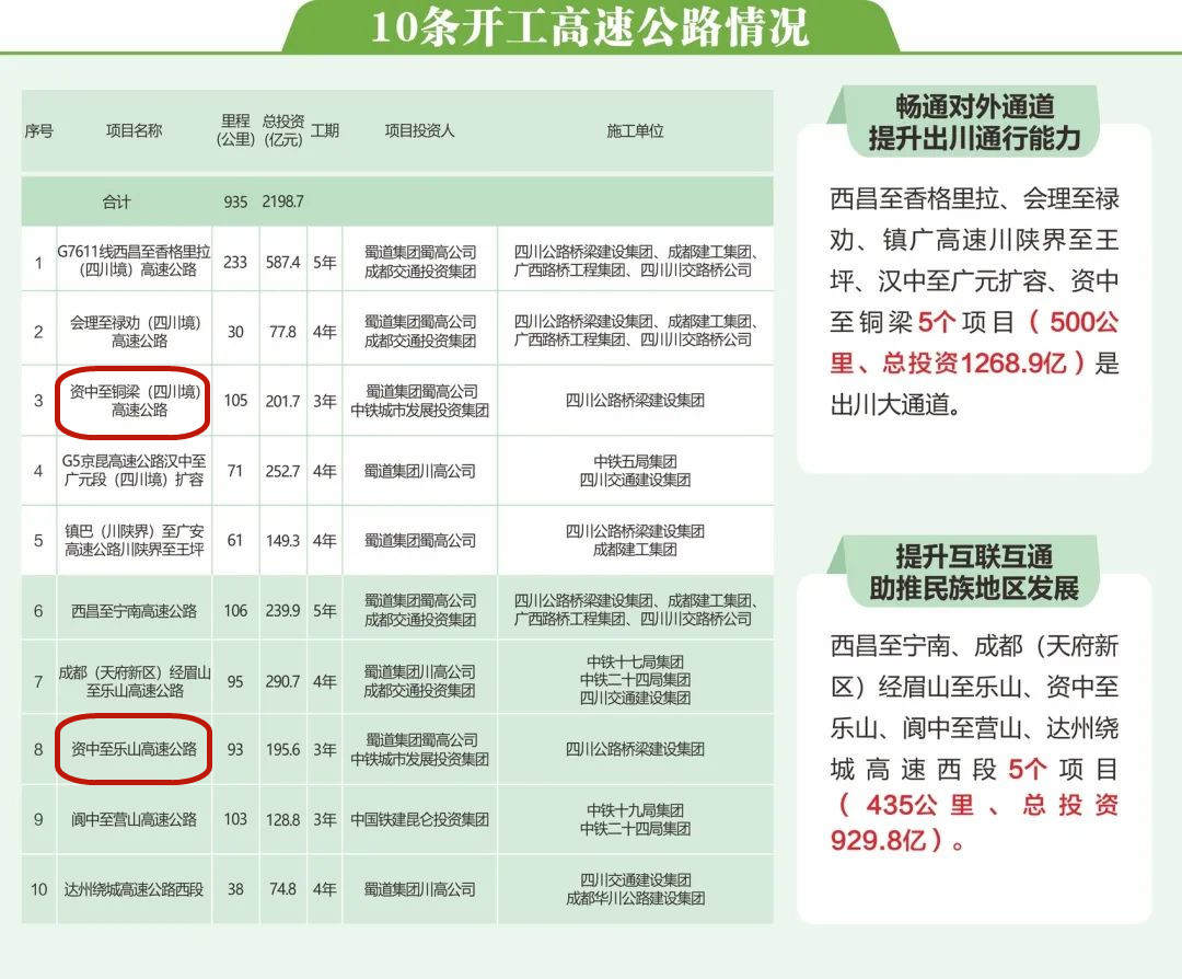 从功能看。高速公路建设等级高,速度快,是交通大通道、经济大动脉。此次开工的10个高速公路项目中,有5个是出川的通道性项目,占比达一半。其中,G7611线西昌至香格里拉、会理至禄劝高速公路将成为南向连接云南的大通道;G5京昆高速汉中至广元扩容项目是北向连接陕西的大通道;镇广高速川陕界至王坪段全线建成后,将成为陕西经四川到重庆的最便捷大通道,北向、东向兼顾;资中至铜梁高速公路则是东向出川通道,也是成渝地区双城经济圈内又一大通道,将进一步加强双圈互联互通。