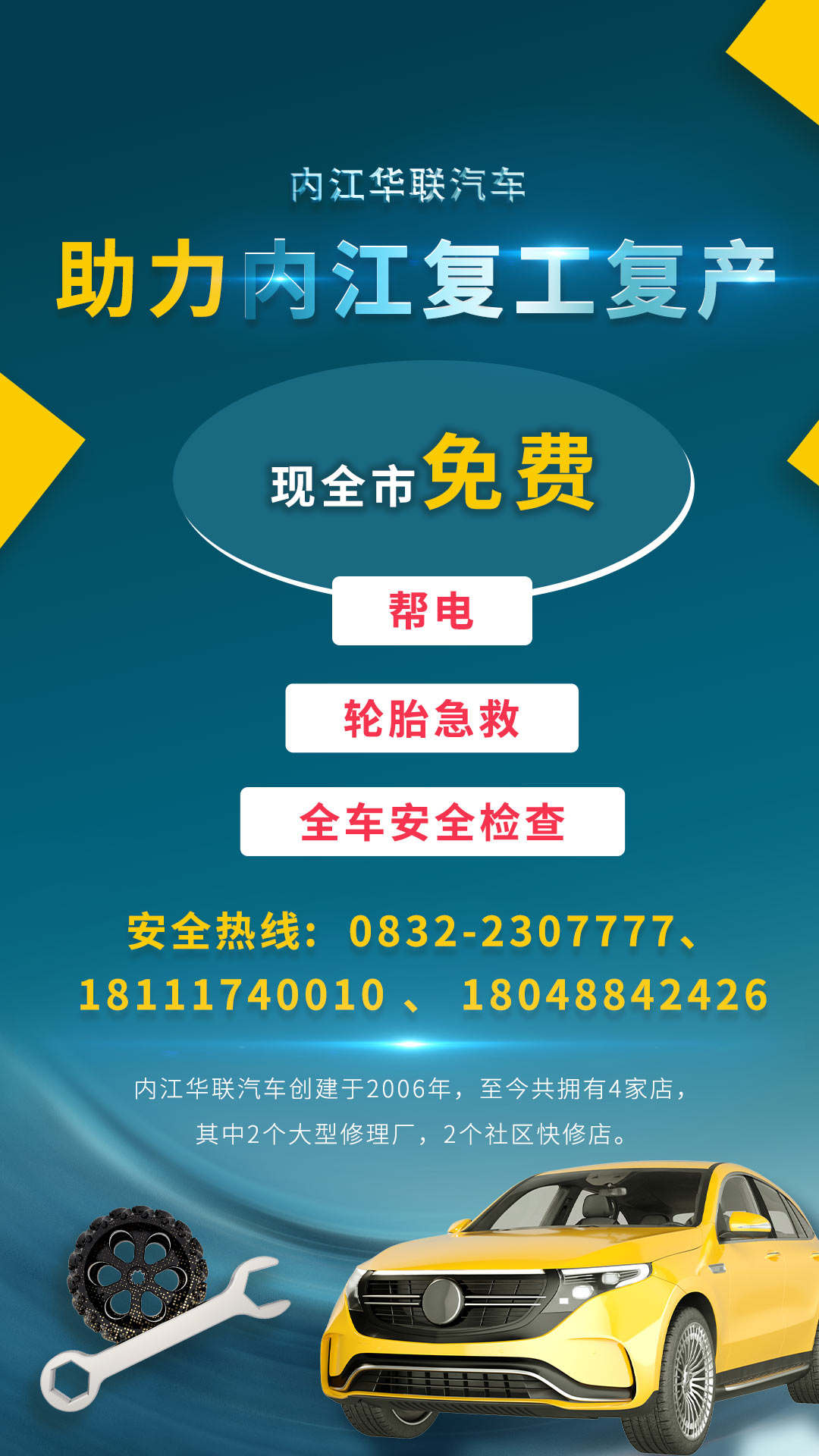 内江华联汽车助力大家复工复产,为全市提供免费帮电、免费轮胎急救、免费全车安全检查等服务,内江华联汽车拥有专用救援车(持有通行证)可直达内江各个小区和地方,疫情期间不间断提供应急保障。