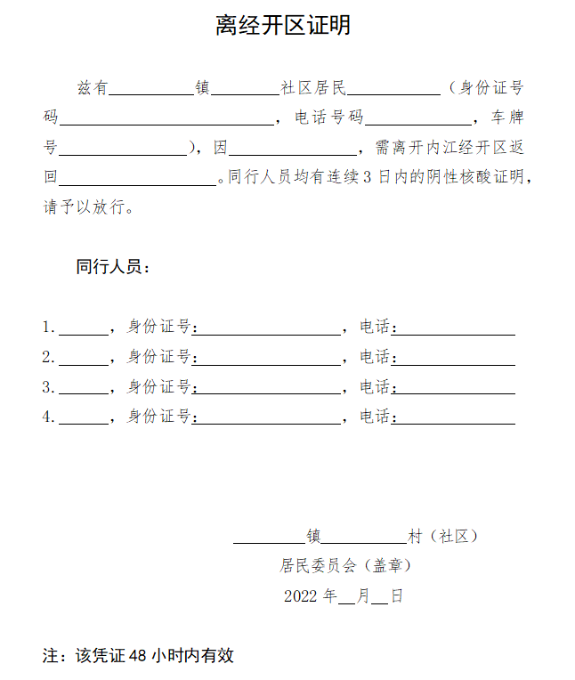离区人员向村(社区)填报离经开区通行证明(见附件)一式两份,提交相关资料,村(社区)核实并在通行证明上签字盖章。