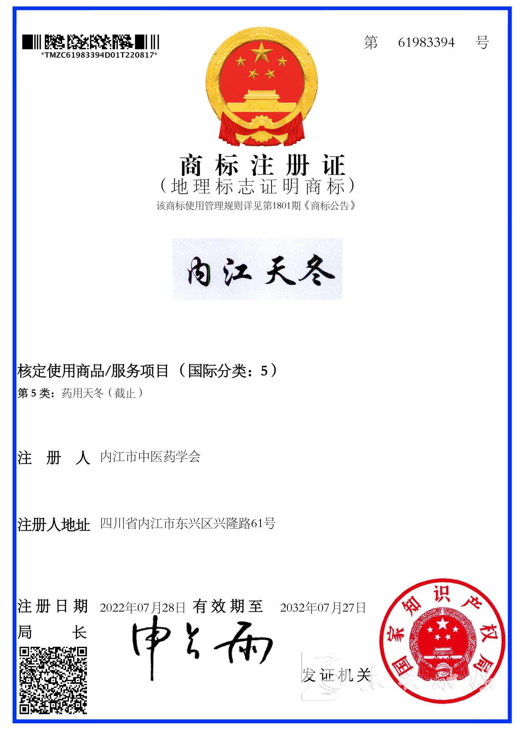 时间:2022-09-28 16:26:27 来源:东兴融媒今年年初,内江市中医药学会向国家知识产权局提出注册“内江天冬”地理标志证明商标申请,申请类别为5类,近日,“内江天冬”商标成功注册,并刊登于国家知识产权局第1801期商标公告上。