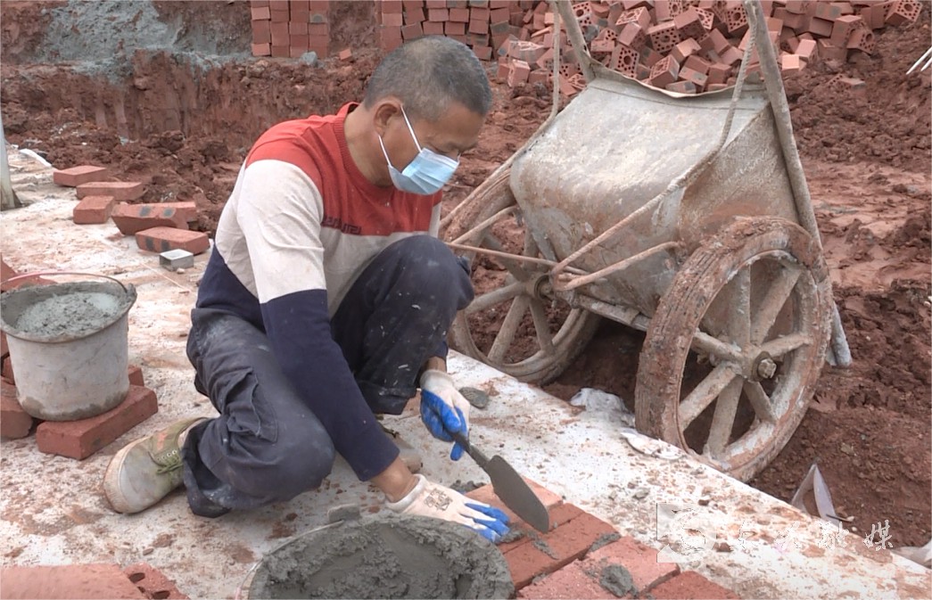 9月27日,在花祠村生猪规模化养殖场,工人们戴好口罩,正在进行和水泥、搬砖、砌砖等工作。而在不远处,一排已经建好的白色规模化养猪场正准备投入使用。
