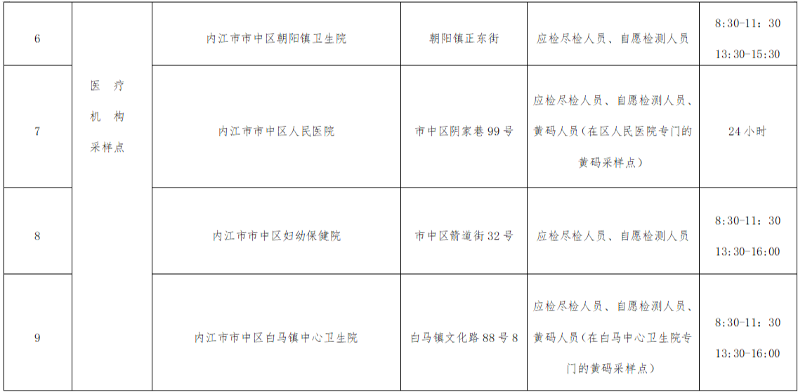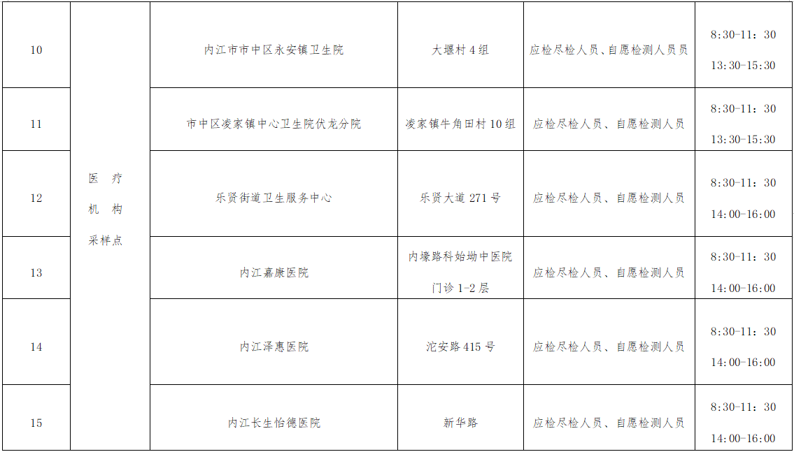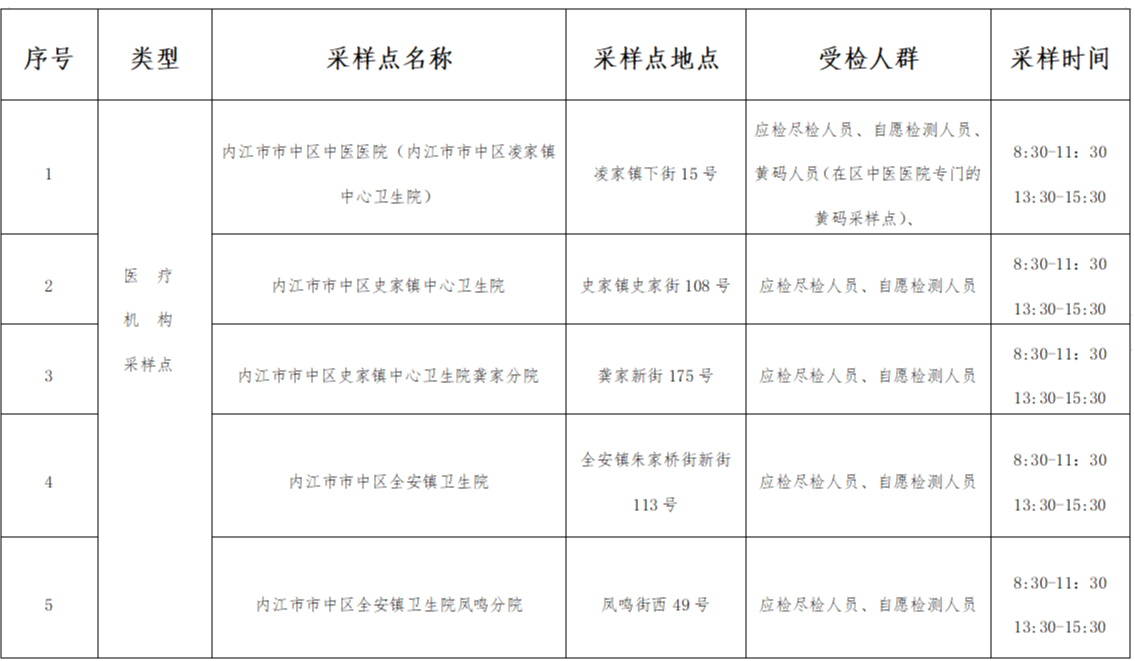 国庆期间,为进一步做好内江市应对新型冠状病毒肺炎疫情常态化工作,落实疫情防控“五早”措施,发挥核酸检测筛查预警作用,满足群众常态化核酸检测需求,市中区在原有29个固定便民采样点的基础上,增设19个机动点位。现将我区48个点位及相关事宜通告如下: