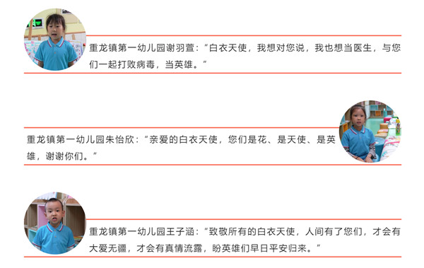 重龙镇第一幼儿园的小朋友以防护服、口罩、棉签、试剂管为元素,绘制抗疫图画,表达对抗疫英雄的感激和崇敬之情。
