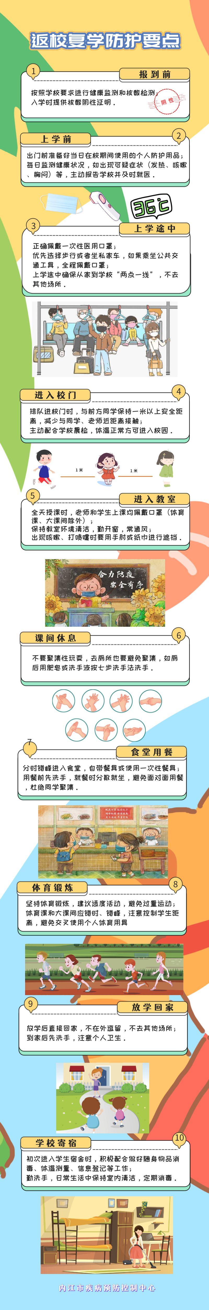 随着疫情防控形势稳定向好,全市各级各类学校有序返校复学。如何正确防护,内江疾控请大家留意以下10点